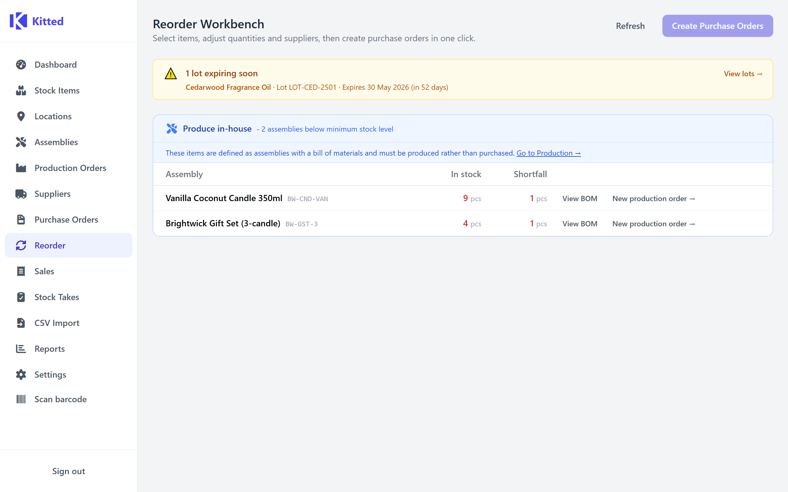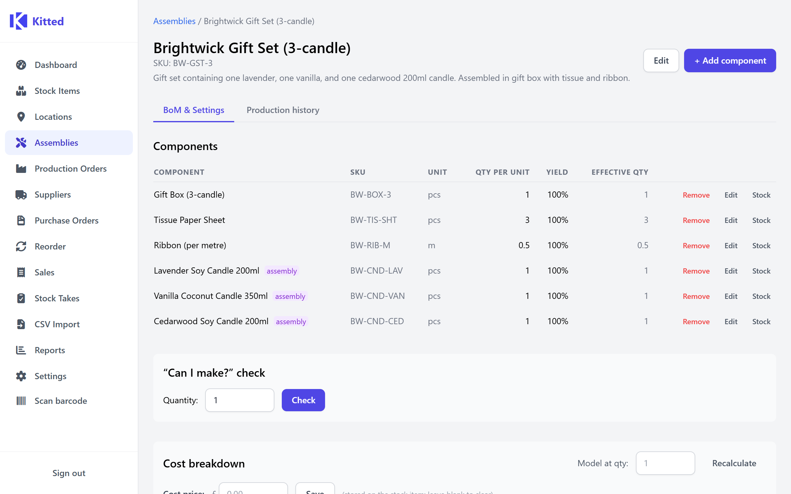Kitted gives small workshops proper BoM-aware stock control without the enterprise price tag or the monthly subscription. Know what you can build, what you need to order, and where every component is.
