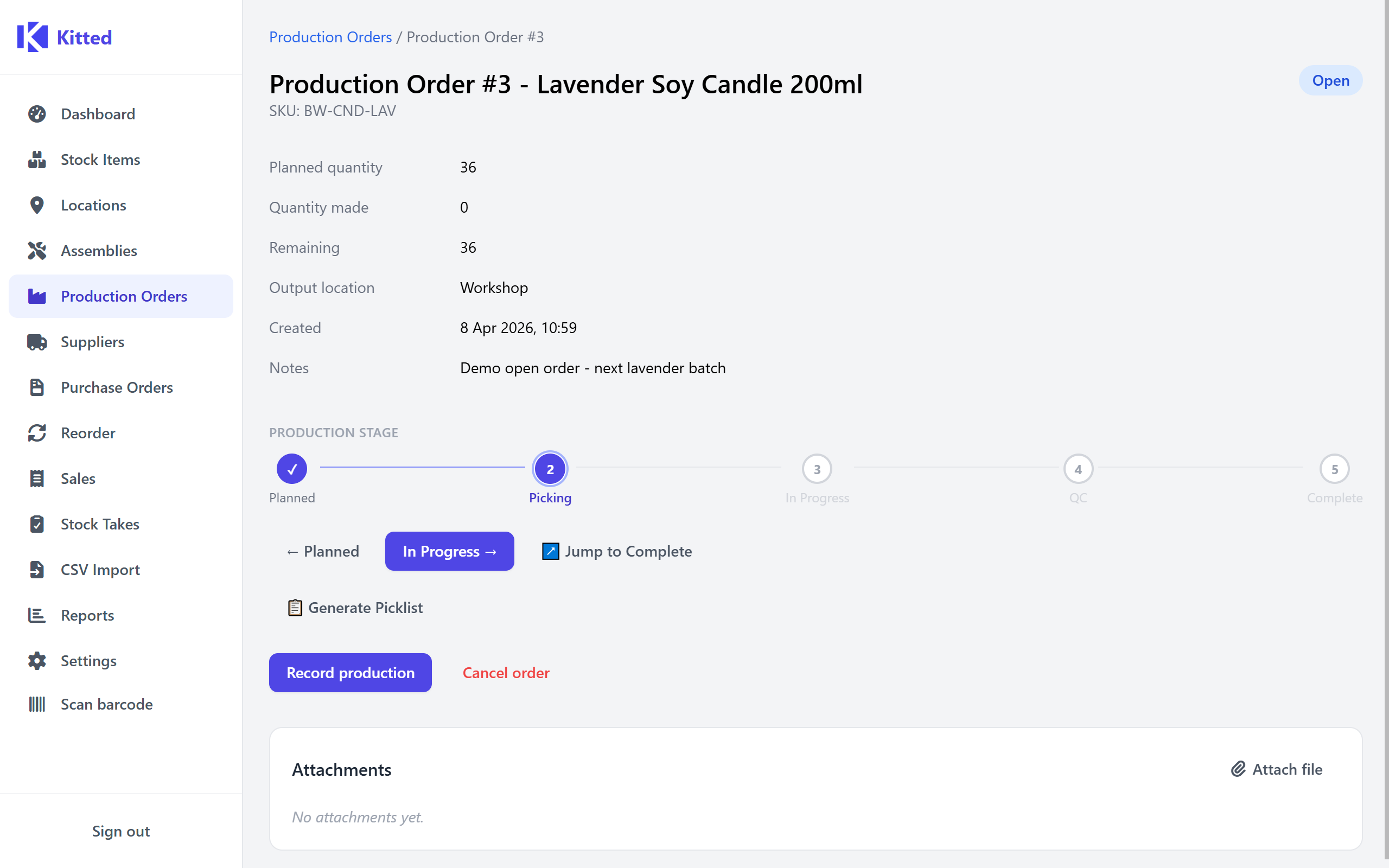 - - Five stages: Planned → Picking → In Progress → QC → Complete.